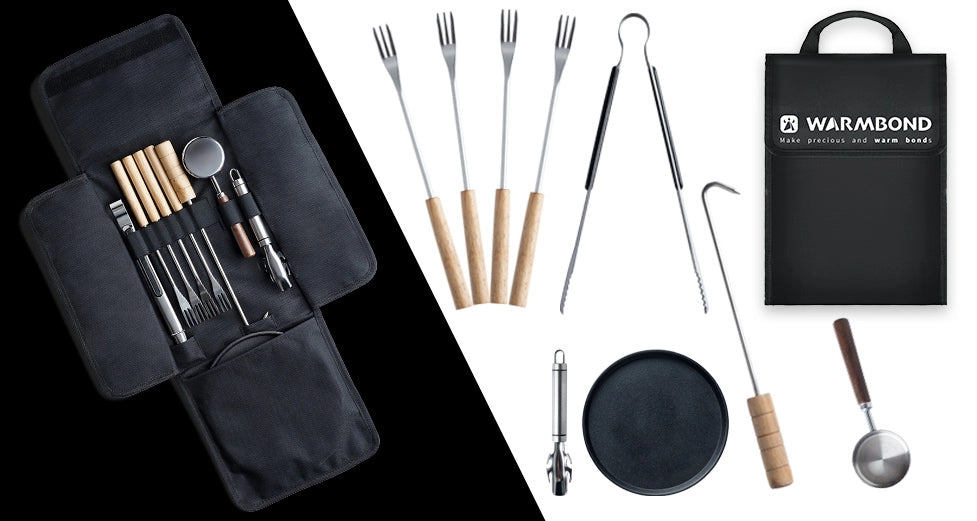 迷你工具包包括 4 根烤棒,非常適合製作棉花糖等。不沾迷你鑄鐵煎鍋和煎鍋升降鉗非常適合烤牛排或準備其他美味佳餚,而烹飪鉗則提供更多功能。
